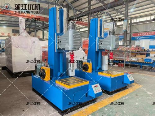 JLX型旋塞阀研磨机由立柱机架、导轨及升降机构、齿轮箱旋转机构、装夹机构等组成,旋转机构的旋转中心线相互垂直。立柱与齿轮箱底板的升降功能通过液压油缸来实现,通过按钮可进行上升或下降。