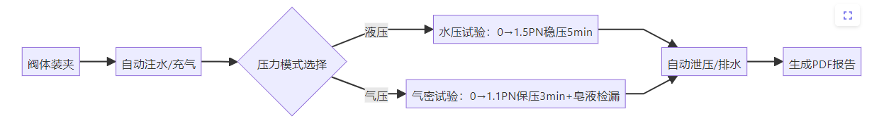 阀体装夹 自动注水/充气 压力模式选择 水压试验:0→1.5PN稳压5min 气密试验:0→1.1PN保压3min+皂液检漏 自动泄压/排水 生成PDF报告